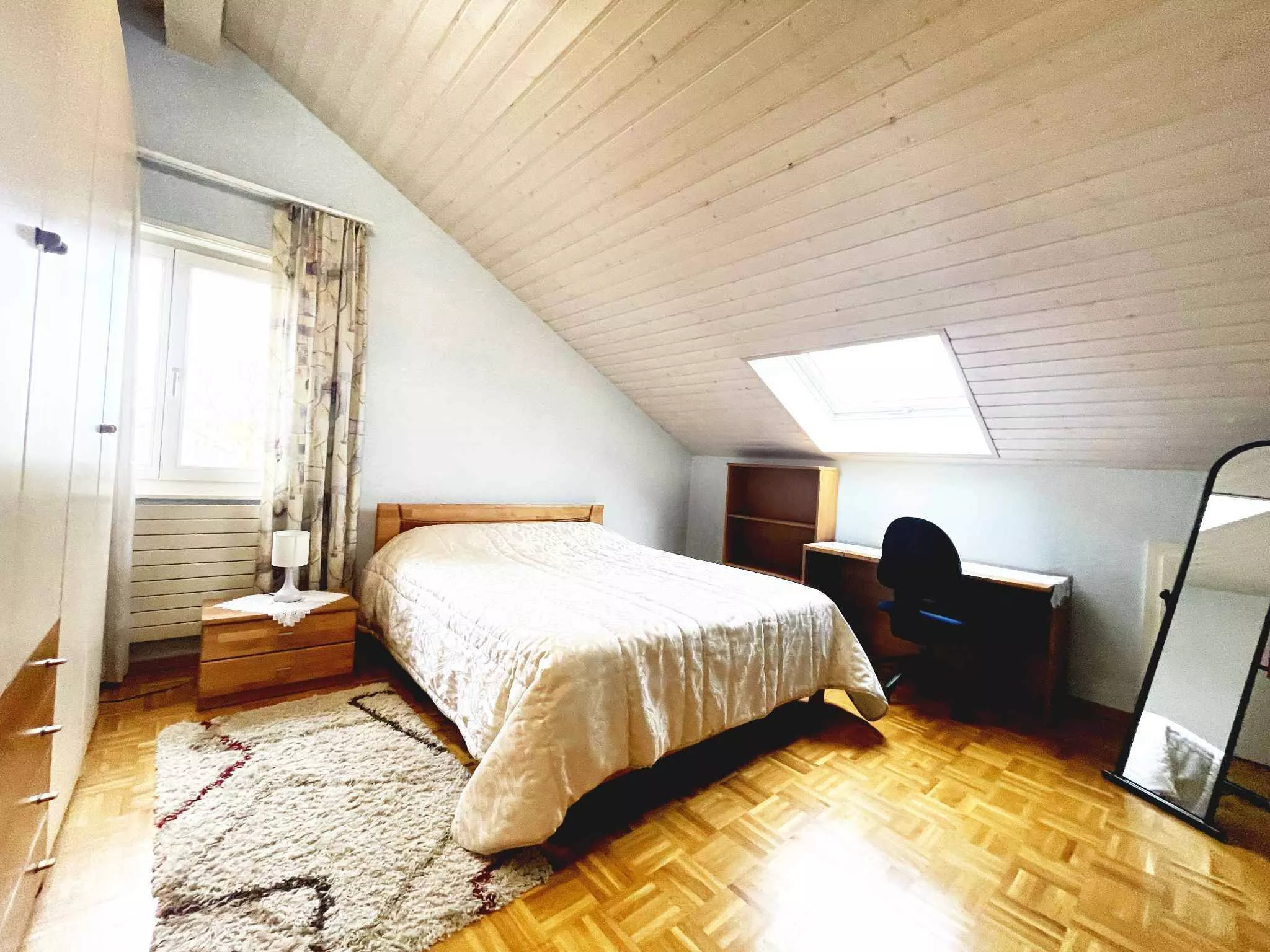 A l’étage se trouve une galerie ouverte donnant sur la partie séjour qui peut être également fermée pour en faire une chambre, d’une chambre à coucher avec armoires, d’une pièce/bureau et local technique, des rangements sous la toiture, ainsi qu’une salle de douche/wc/lavabo.